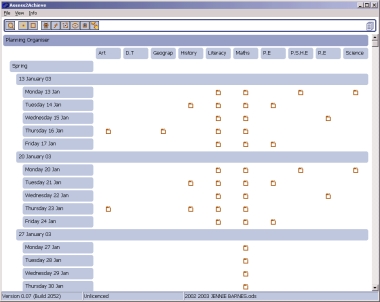 The software has been designed to reflect the paperwork teachers normally use. Within the program each window has been designed to look like a ‘page’ and these pages are placed within Organisers. The teacher has three organisers; a Planning Organiser, an Assessment Organiser and a Report Organiser. Within the planning organiser you are able to create and write plans on a planning page, evaluate them and assess pupils against the outcomes. There is also a lesson note page for each child to be able to note pupil responses within lessons. Within the Assessment Organiser pupil attainment statements are stored and can be read. It is here that more general notes about a pupil can be entered on the pupil note page. Within the Report Organiser you are able to enter absence and late information on the absence page. On a pupil report page, you can access all stored information which enables you to easily create and print your report.