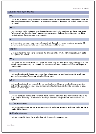 Every page in Assess2Achieve can be printed out. One of the main uses for printing is the annual reports produced for parents. The head teacher is able to combine the files created by each member of staff, then add their own comments and print the reports for parents.