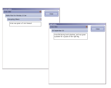 Notes on individual pupils are able to be recorded on two different pages; The Lesson Notes page and the Pupil Notes Page Lesson Notes reflect the pupil response to lessons and they can be written when recording outcomes. The teacher can use this page to record comments on the pupil?s learning and to make either positive or negative behaviour observations . Pupil Notes enable general notes to be recorded at any time, and can refer to other important information relating to the child?s education, but is not directly linked with specific lessons. For example it can be used for recording playground incidents, medical information, friendship notes, family background and so on.